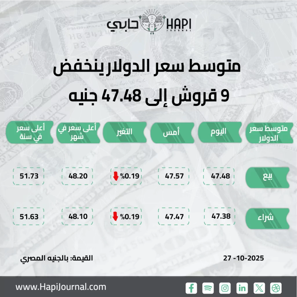 يارا الجنايني– تراجع سعر صرف الدولار أمام الجنيه في ختام تعاملات اليوم الإثنين بمقدار 9 قروش، ليسجل متوسط سعر 47.38 جنيه للشراء و47.48 جنيه للبيع، مقابل 47.47 جنيه للشراء و47.57 جنيه للبيع أمس، وفقًا لبيانات البنك المركزي المصري.