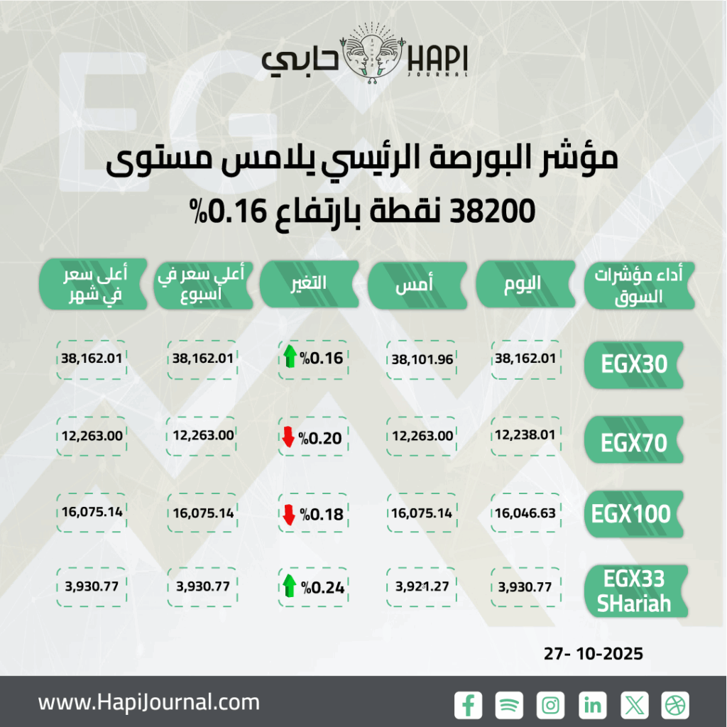مؤشر البورصة الرئيسي يلامس مستوى 38200 نقطة بارتفاع 0.16%