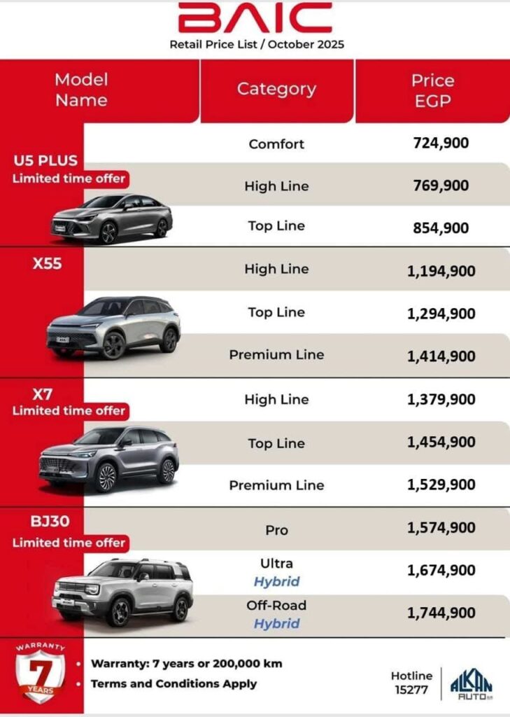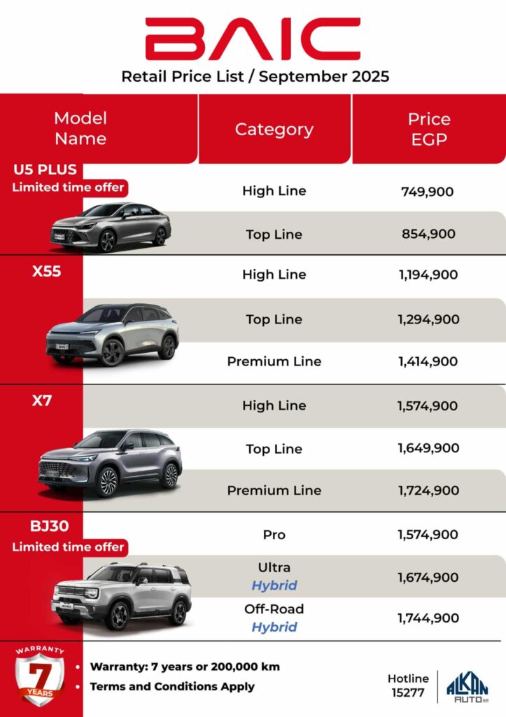 وبحسب القائمة السعرية المعلنة، انخفض سعر الفئة الأولى من بايك X7 إلى 1.379.900 جنيه، مقابل 1.574.900 جنيه.