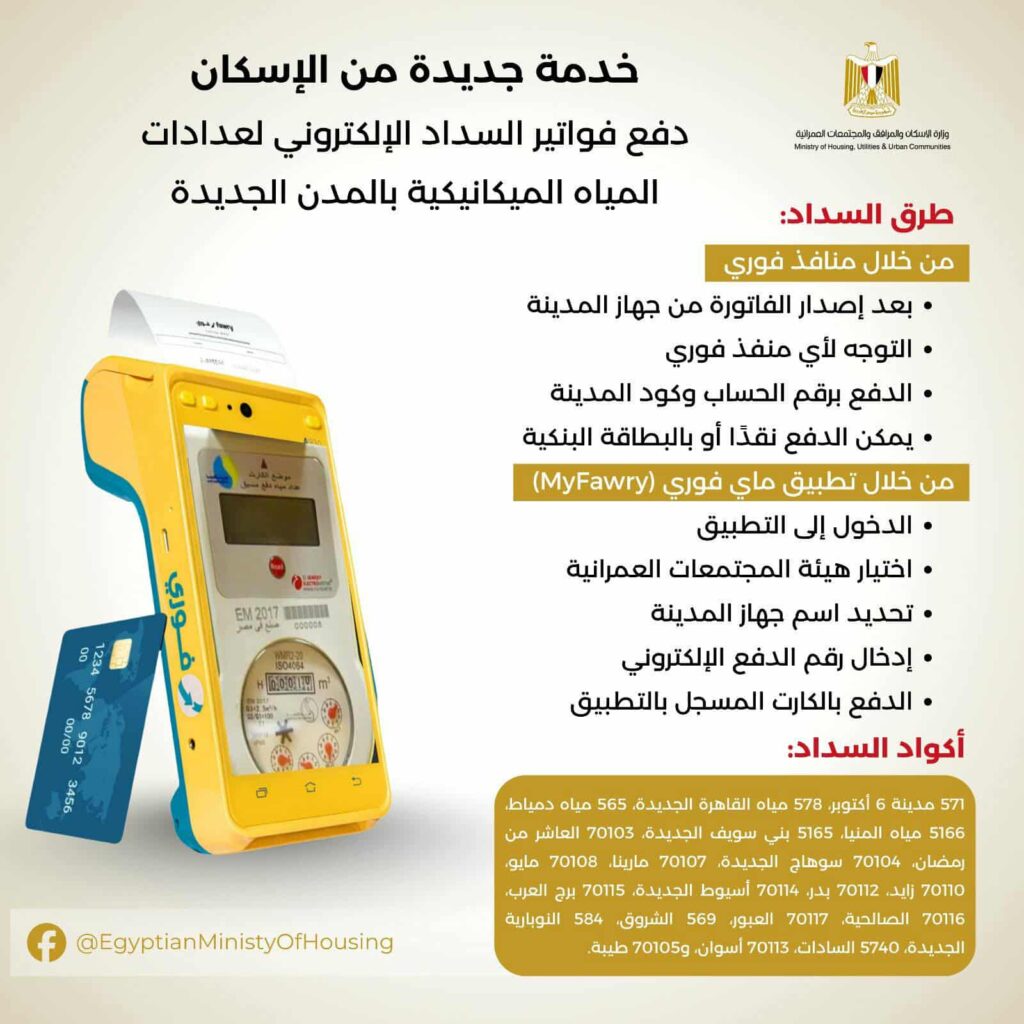 حمدي أحمد _ أعلنت وزارة الإسكان والمرافق والمجتمعات العمرانية، عن إتاحة سداد فواتير مياه العدادات الميكانيكية بالمدن الجديدة من خلال منافذ فوري وتطبيق الهاتف المحمول “ماي فوري”.