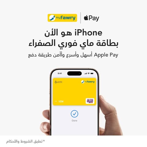 وتتميز Apple Pay بأنها سهلة الإعداد على iPhone، حيث يمكن فتح تطبيق Apple Wallet، والنقر على +، واتباع الخطوات لإضافة بطاقة ماي فوري الصفراء، بمجرد أن يضيف العميل البطاقة إلى iPhone أو Apple Watch أو iPad أو Mac، يمكنه البدء في استخدام Apple Pay على ذلك الجهاز على الفور.