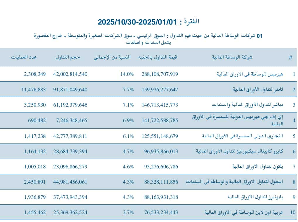 رنا ممدوح .. حافظت شركة شركة هيرميس للوساطة في الأوراق المالية، على صدارة ترتيب شركات الوساطة في الأوراق المالية، عن تعاملات البورصة المصرية، منذ بداية العام وحتى نهاية شهر أكتوبر الماضي، بعد تنفيذ تداولات إجمالية بقيمة 288.108 مليار جنيه، أمنت لها حصة سوقية بنسبة 14%.