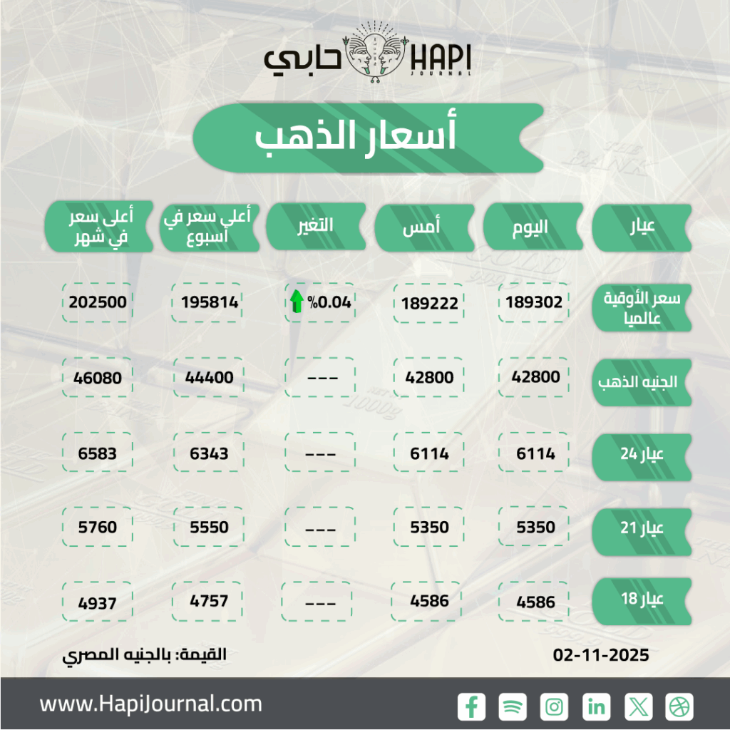 شاهندة إبراهيم – تراجعت أسعار الذهب في السوق المحلية بنحو 3.6% وبقيمة 200 جنيهًا خلال تعاملات الأسبوع الماضي، وعالميًا هبطت الأوقية بنحو 111 دولارًا، من 4114 دولارًا، وأغلقت عند 4003 دولارات.