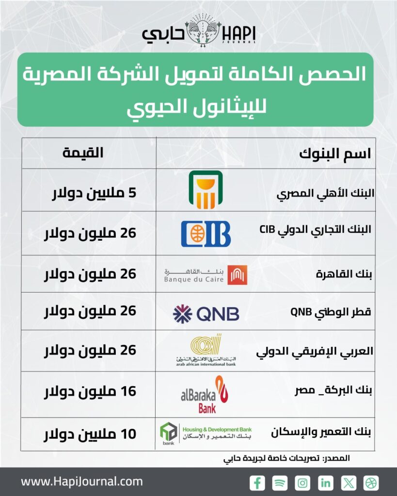 أمنية إبراهيم _ كشفت مصادر مطلعة لجريدة «حابي» عن توزيع حصص البنوك المشاركة في ترتيب تمويل الشركة المصرية للإيثانول الحيوي التابعة للشركة المصرية القابضة للبتروكيماويات، والبالغ قيمته الإجمالية 135 مليون دولار.