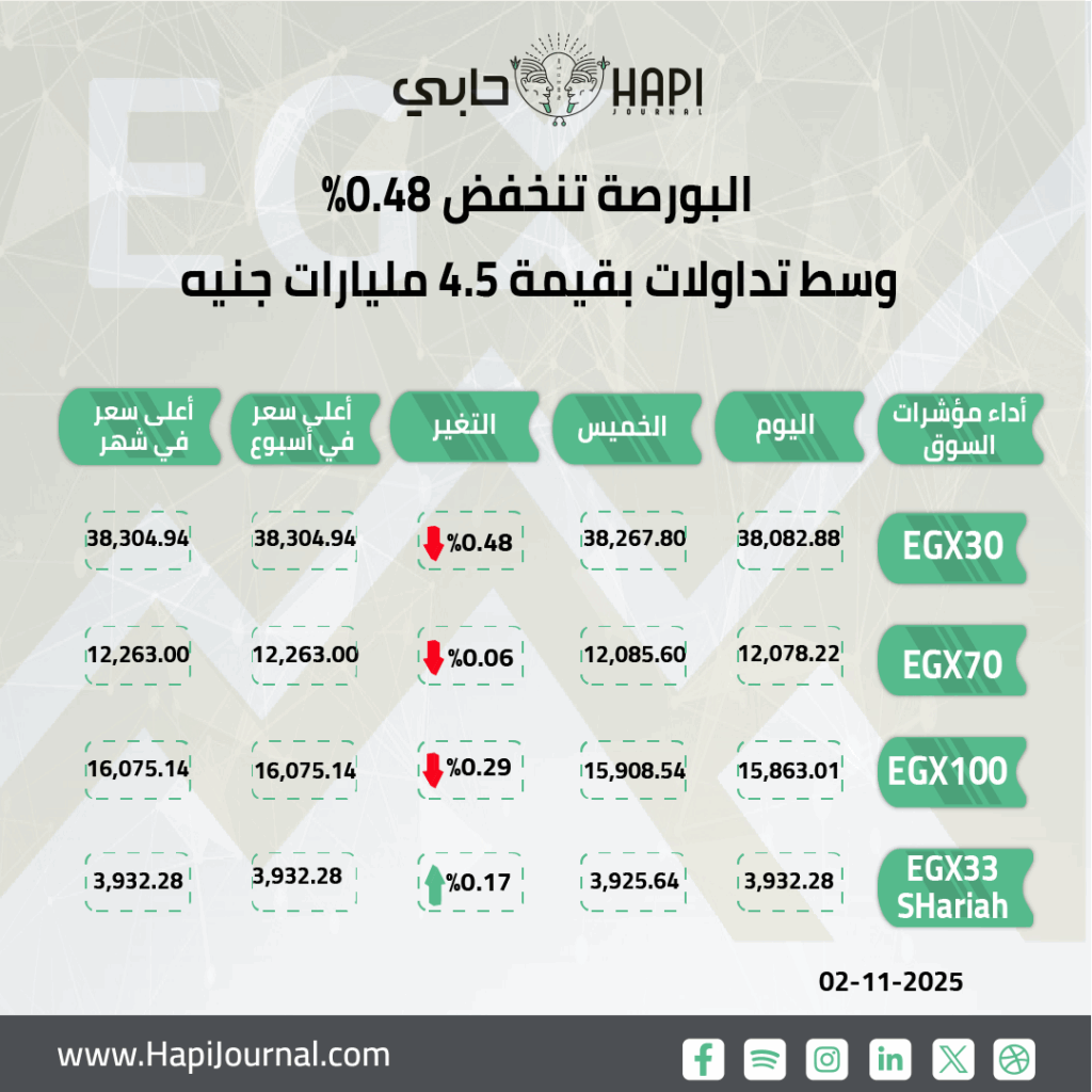 رنا ممدوح _ اختتمت مؤشرات البورصة المصرية تعاملات اليوم الأحد على تراجع جماعي، وانخفض المؤشر الرئيسي EGX30 بنسبة 0.48%، وأغلق عند مستوى 38082 نقطة.