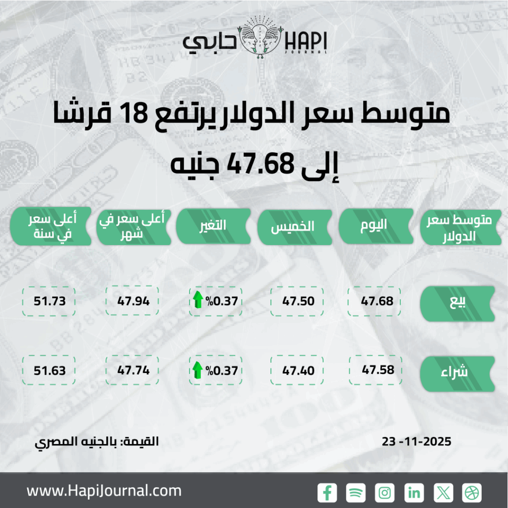 وعلى صعيد التعاملات المصرفية، ارتفع الدولار إلى 47.58 جنيه للشراء و47.68 جنيه للبيع في بنوك: الأهلي المصري ومصر والتجاري الدولي (CIB) والإسكندرية والمصري الخليجي والشركة المصرفية (saib) وبيت التمويل الكويتي.