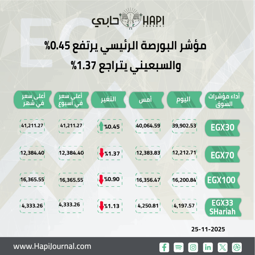 رنا ممدوح _ اختتم مؤشر البورصة المصرية تعاملات اليوم الثلاثاء على ارتفاع بنسبة 0.45%، وأغلق عند مستوى 39902 نقطة.