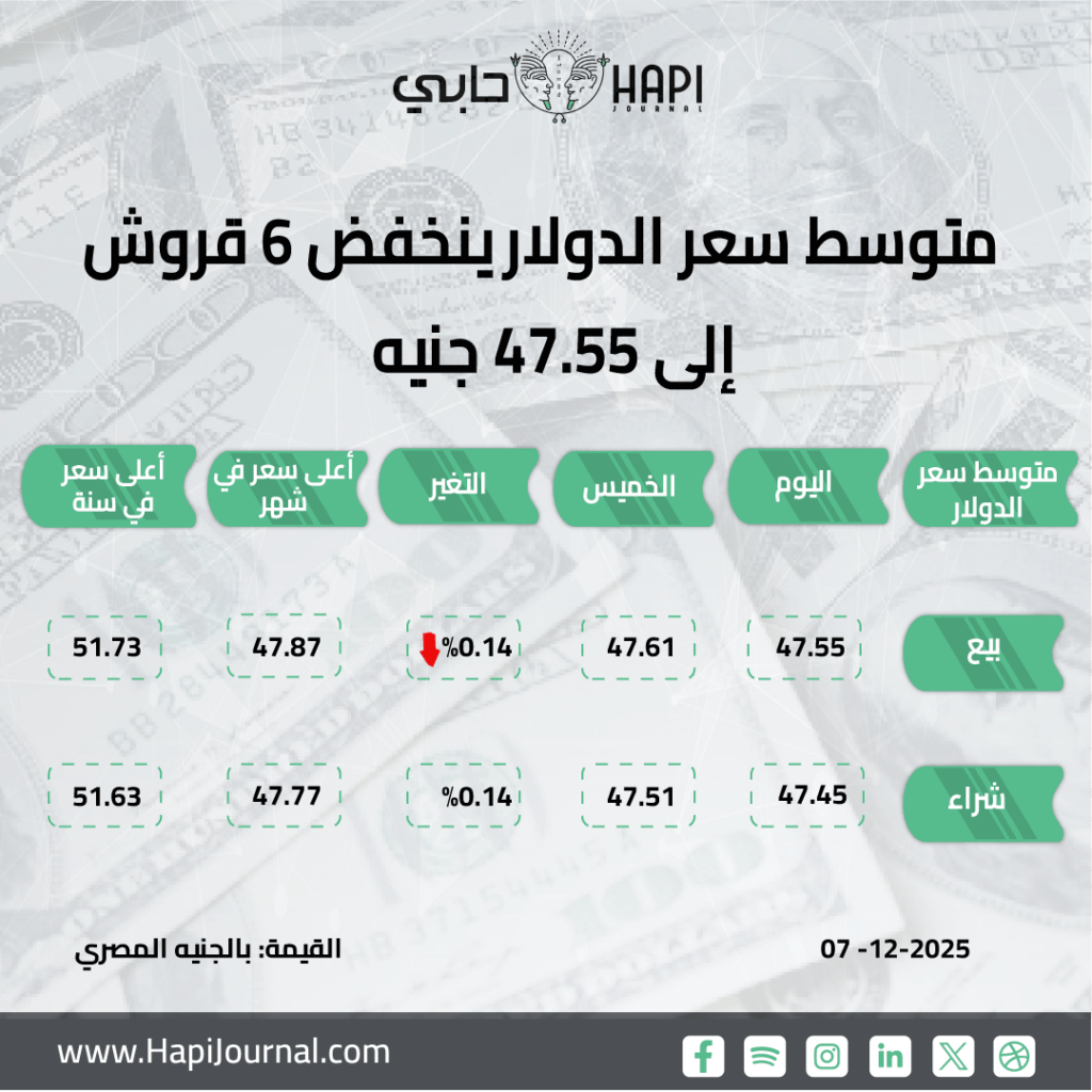 وسجل 47.44 جنيه للشراء و47.54 جنيه للبيع في بنوك: التجاري الدولي (CIB)، قطر الوطني (QNB)، بيت التمويل الكويتي، التعمير والإسكان، البنك العربي الأفريقي، والكويت الوطني.