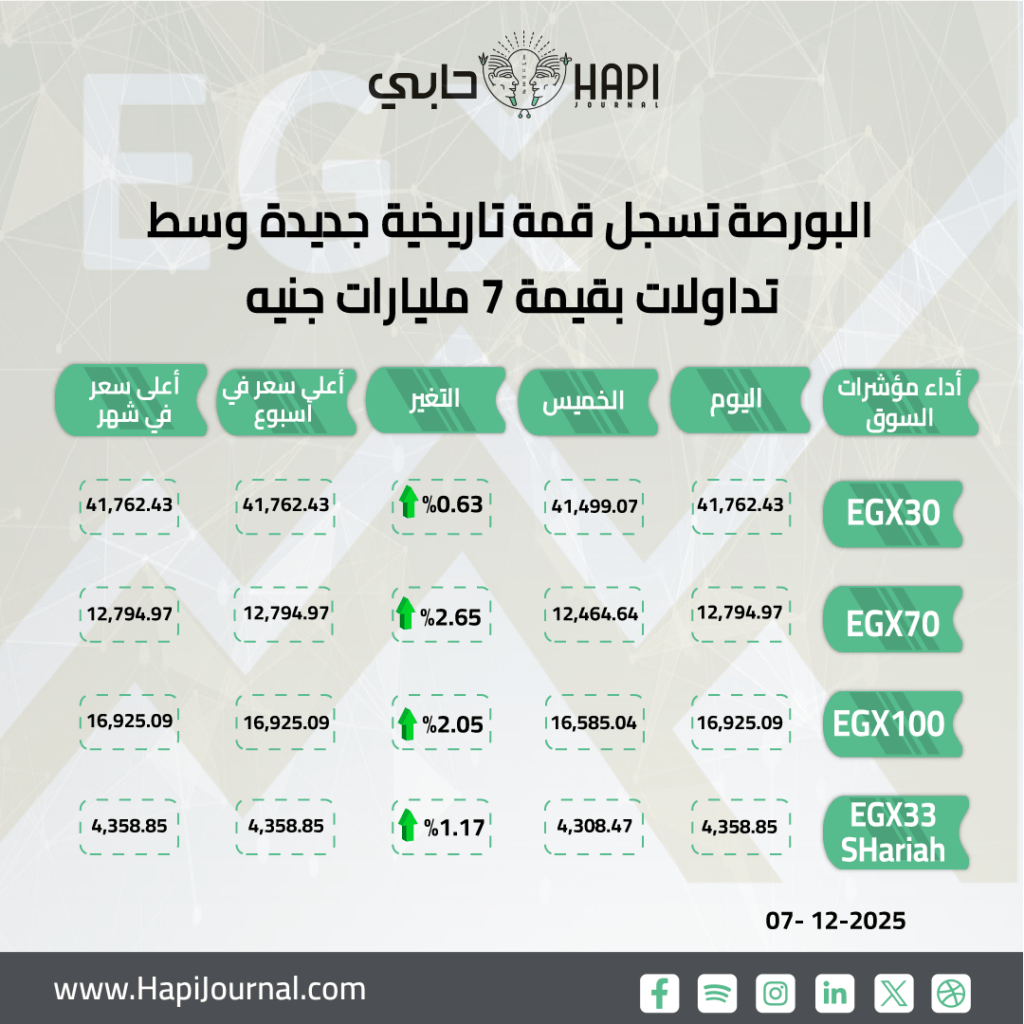 رنا ممدوح _ اختتمت مؤشرات البورصة المصرية تعاملات اليوم الأحد على ارتفاع جماعي، وصعد المؤشر الرئيسي EGX30 بنسبة 0.63%، وأغلق عند مستوى 41762 نقطة.