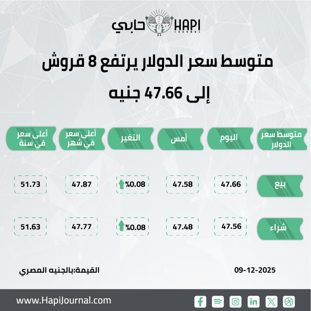 وصعد الدولار إلى 47.59 جنيه للشراء و47.69 جنيه للبيع في البنك التجاري الدولي (CIB)، وإلى 47.60 جنيه للشراء و47.70 جنيه للبيع في بنكي الكويت الوطني والأهلي الكويتي.