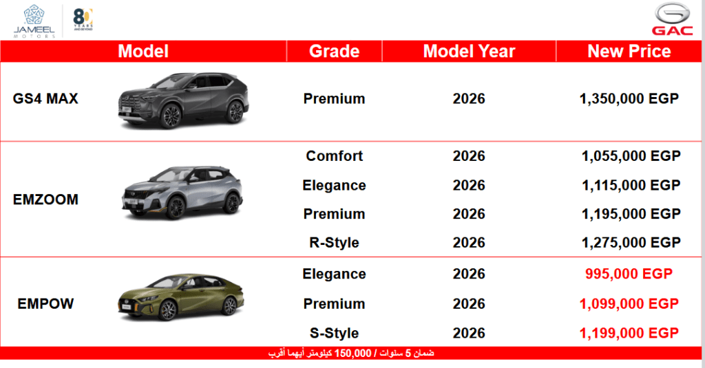 شاهندة إبراهيم – أعلنت شركة جميل موتورز تخفيض أسعار سيارات GAC EMPOW موديلات 2026 بقيمة تراوحت بين 85 و141 ألف جنيه.