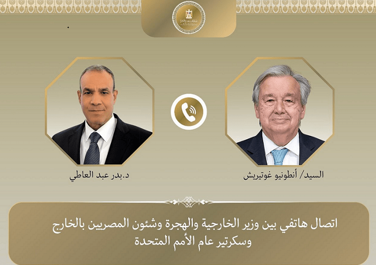 جاء ذلك خلال اتصال هاتفي تلقاه عبد العاطي من أنطونيو جوتيريش، السكرتير العام للأمم المتحدة، جرى خلاله بحث تطورات الأوضاع في الأراضي الفلسطينية المحتلة والجهود الدولية المبذولة لدعم مسار التهدئة وتثبيت وقف إطلاق النار في غزة وتحقيق التهدئة في الضفة الغربية.