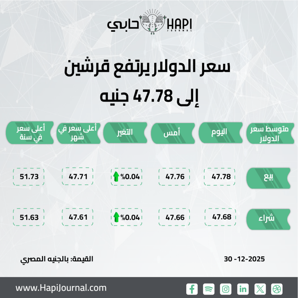 يارا الجنايني– ارتفع متوسط سعر صرف الدولار أمام الجنيه في ختام تعاملات اليوم الثلاثاء بمقدار قرشين، ليسجل 47.68 جنيه للشراء و47.78 جنيه للبيع، مقابل 47.66 جنيه للشراء و47.76 جنيه للبيع في تعاملات أمس، وفقًا لبيانات البنك المركزي المصري.