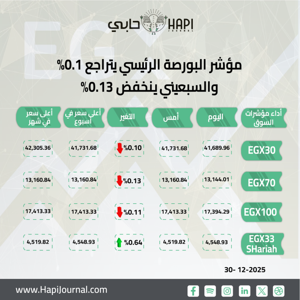 رنا ممدوح _ اختتمت مؤشرات البورصة المصرية تعاملات اليوم الثلاثاء على تراجع جماعي، وانخفض المؤشر الرئيسي EGX30 بنسبة 0.1%، وأغلق عند مستوى 41689 نقطة.