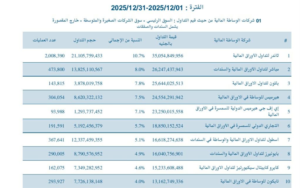 تايكون للوساطة في المرتبة العاشرة نظير تعاملات بقيمة 13.162 مليار جنيه