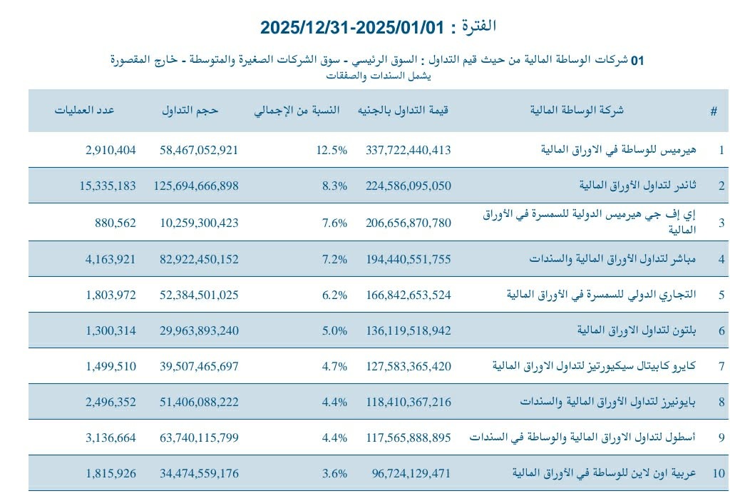 عاجل.. هيرميس تتربع على عرش شركات الوساطة بحصة سوقية 12.5% في 2025