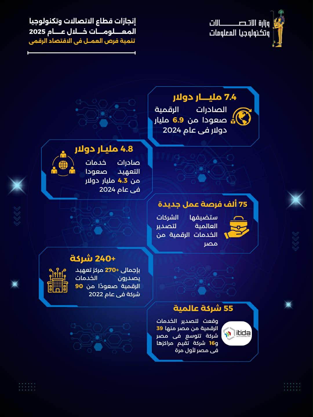ارتفاع قيمة الصادرات الرقمية إلى 7.4 مليار دولار صعودا من 6.9 مليار دولار في عام 2024، بمعدل نمو بلغ 124% خلال 7 أعوام، وتأتي هذه الزيادة مدفوعة بالنمو المتواصل في صادرات خدمات التعهيد، حيث تضاعفت قيمة صادرات التعهيد خلال الثلاث سنوات الأخيرة لتصل إلى4.8 مليار دولار فى 2025 صعودا من 4.3 مليار دولار فى عام 2024 و2.4 مليار دولار في عام 2022.