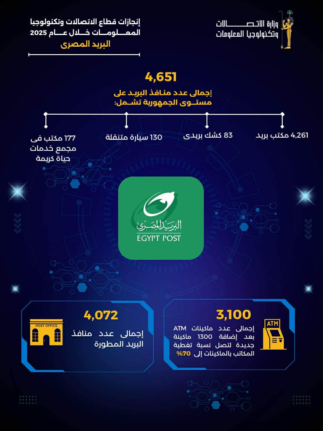 استكمال خطة تطوير البريد المصري وزيادة فروعه وتوسيع الخدمات بما يتوافق مع استراتيجية مصر الرقمية ومتطلبات المواطنين، حيث بلغ عدد المكاتب المطورة 4,072 من إجمالي 4,651 منفذ بريد، تشمل 4,261 مكتب بريد، و83 كشكًا بريديًا، و130 سيارة متنقلة، و177 مكتبًا في مجمعات خدمات “حياة كريمة”.
