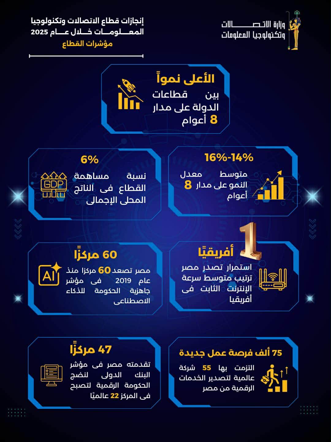 حافظ قطاع الاتصالات وتكنولوجيا المعلومات على مكانته كأعلى قطاعات الدولة نموًا خلال العام المالي 2024/2025 ليواصل بذلك تصدره لقائمة القطاعات الأعلى نموًا على مدار 8 أعوام بمعدلات نمو تتراوح بين 14%-16٪. فيما بلغت نسبة مساهمة القطاع في الناتج المحلي الإجمالي نحو 6%.