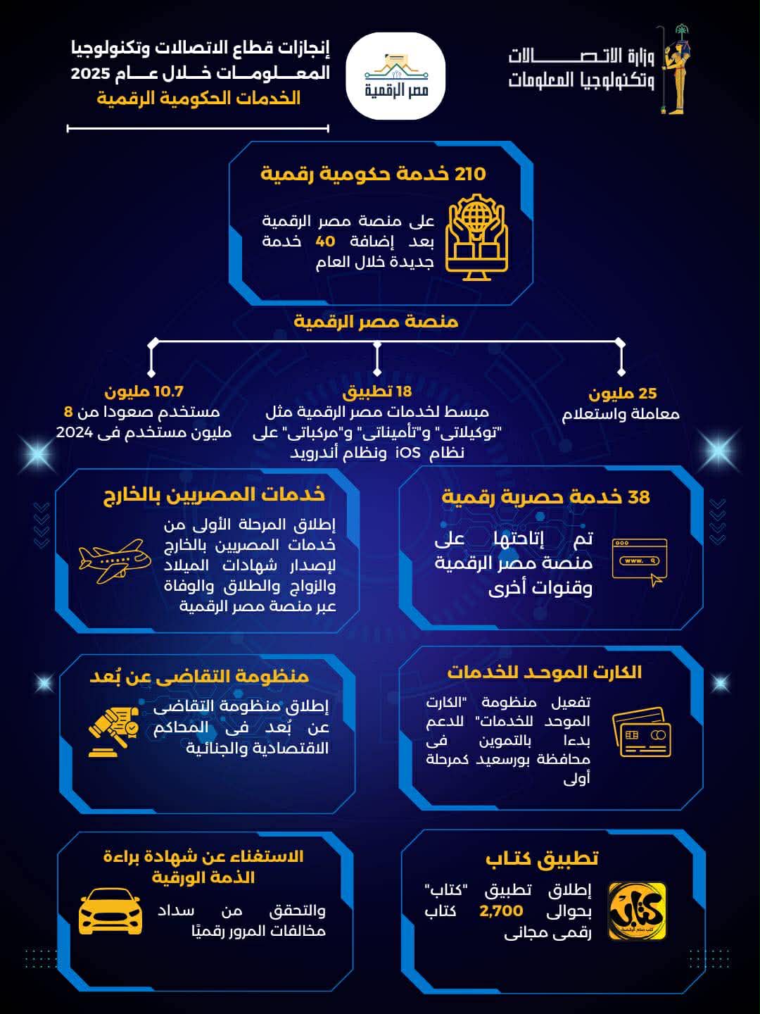 شهدت منصة مصر الرقمية نموًا ملحوظًا خلال عام 2025، حيث بلغ عدد الخدمات الحكومية الرقمية على المنصة 210 خدمة رقمية صعودا من 170 خدمة في 2024، كما ارتفع عدد المستخدمين بنسبة 28% صعودا من 8.1 مليون مستخدم في عام 2024 إلى 10.7 مليون مستخدم في عام 2025. كذلك ارتفع عدد المعاملات المنفذة عبر المنصة بنسبة 300% خلال عام 2025، ليصل إلى أكثر من 25 مليون معاملة واستعلام، مقارنة بـ7.8 مليون معاملة فى عام 2024.