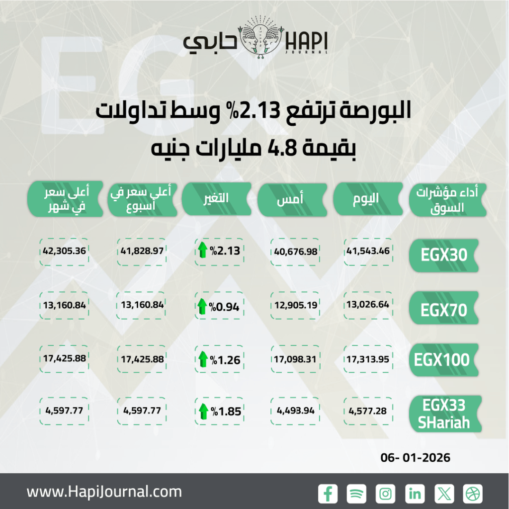 وارتفع المؤشران EGX70 وEGX100 متساويا الأوزان بنسبة 0.94% و1.26% على الترتيب.