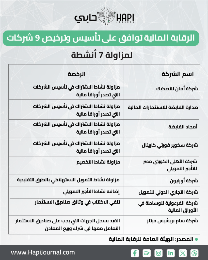 الرقابة المالية توافق على تأسيس وترخيص 9 شركات لمزاولة 7 أنشطة