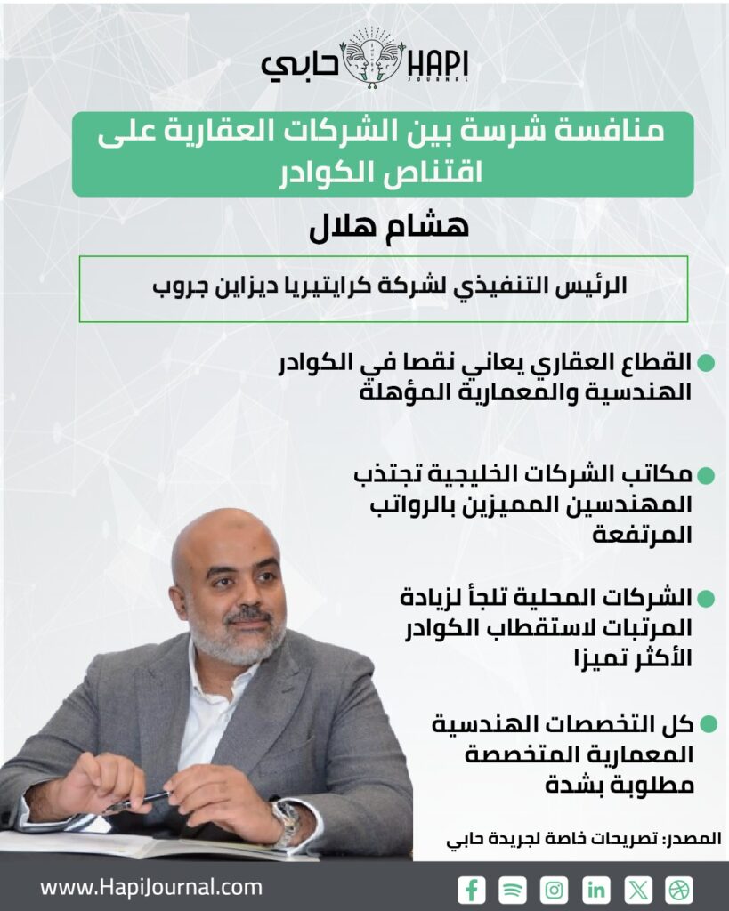 حمدي أحمد _ قال المهندس هشام هلال، الرئيس التنفيذي لشركة كرايتيريا ديزاين جروب للاستشارات المعمارية والهندسية، إن هناك منافسة قوية بين الشركات المعمارية والهندسية على المهندسين المتخصصين المميزين، خاصة وأن مهندسي الشركات العقارية يختلفون عن مهندسي المكاتب المعمارية الاستشارية .