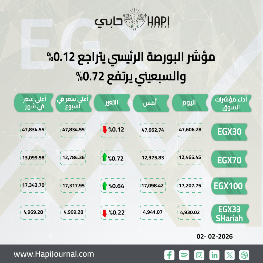 رنا ممدوح _ تراجع مؤشر البورصة المصرية الرئيسي EGX30 في ختام تعاملات اليوم الإثنين بنسبة 0.12%، وأغلق عند مستوى 47606 نقطة.