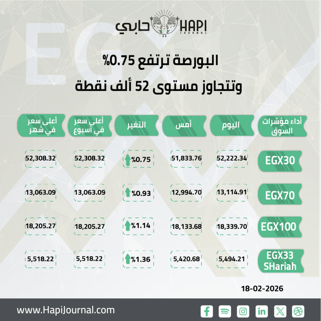 رنا ممدوح _ اختتمت مؤشرات البورصة المصرية تعاملات اليوم الأربعاء على ارتفاع جماعي، وصعد المؤشر الرئيسي EGX30 بنسبة 0.75%، وأغلق عند مستوى 52222 نقطة.