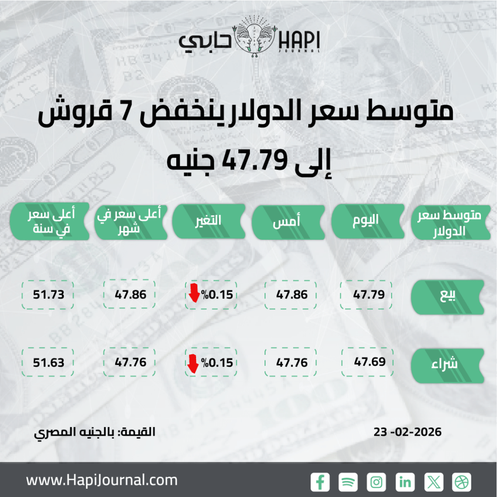 الدولار يتراجع 7 قروش ليسجل متوسط البيع 47.79 جنيه بنهاية تعاملات اليوم