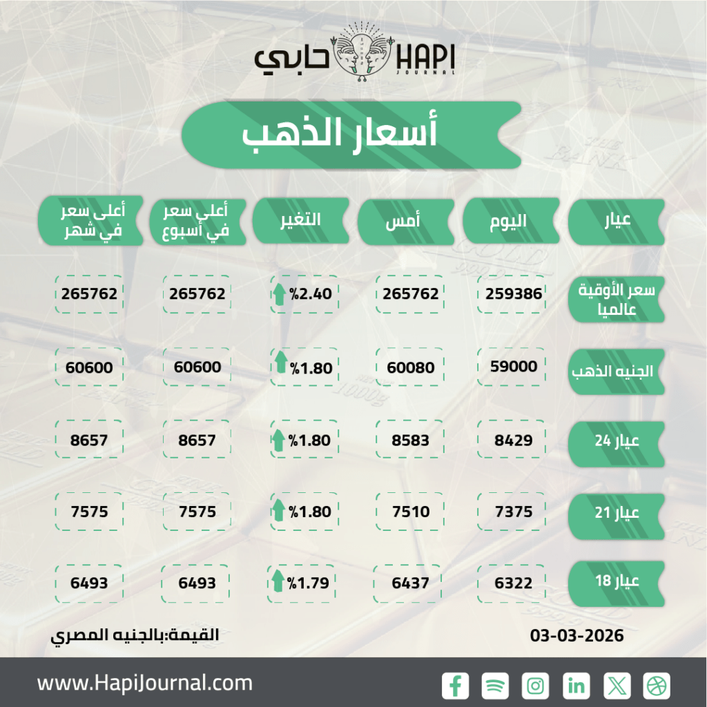 وسجل عيار 24 نحو 8423 جنيهًا، وبلغ عيار 18 حوالي 6317 جنيهًا، فيما اقترب سعر الجنيه الذهب من 58960 جنيهًا.