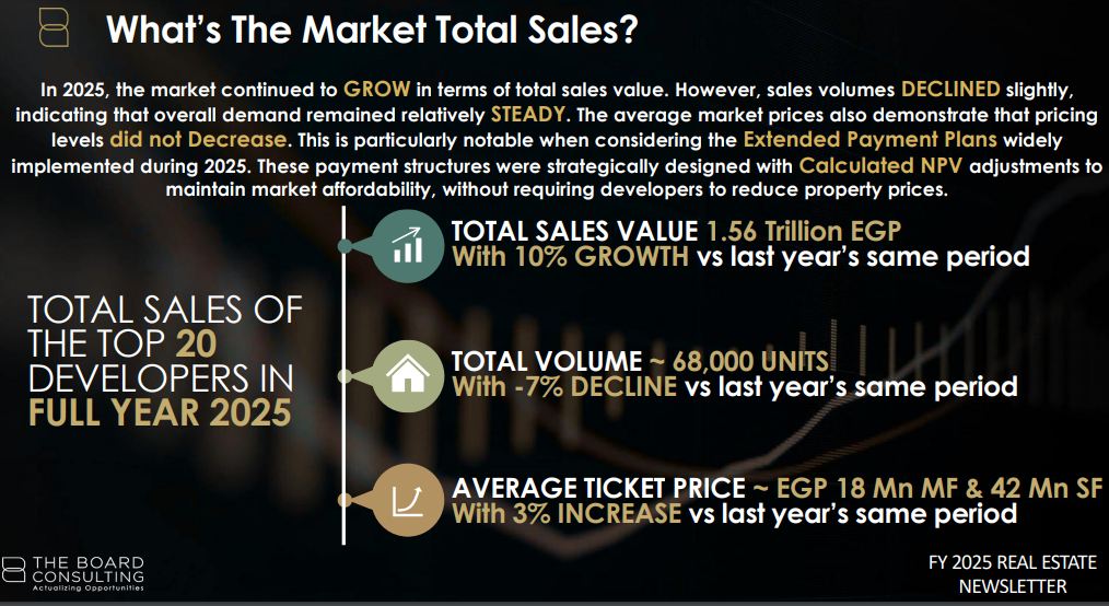 ووفقًا للتقرير الصادر عن شركة ذا بورد كونسالتينج لأبحاث ودراسات السوق للمطورين العقاريين، بلغت مبيعات أكبر 10 شركات نحو 1.26 تريليون جنيه بزيادة 12% عن 2024.