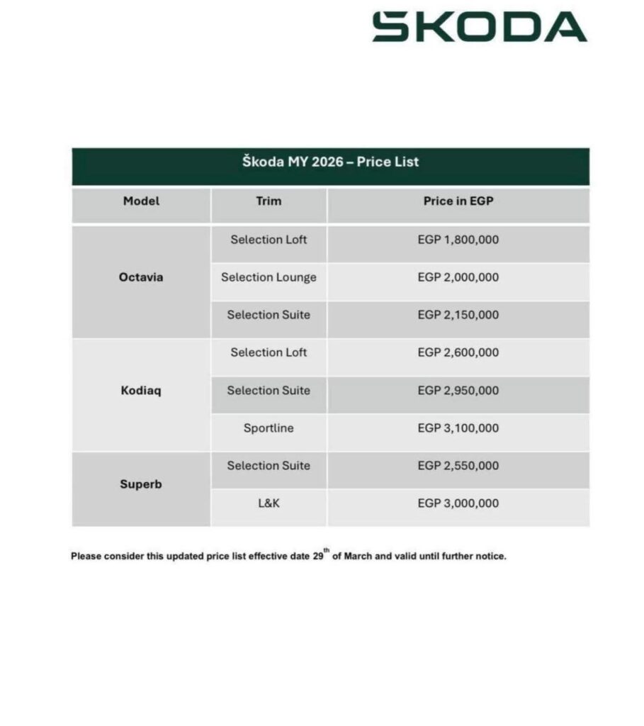 وارتفع سعر الفئة الأولى من السيارة سكودا أوكتافيا إلى مليون و800 ألف جنيه، مقابل مليون و650 ألف جنيه، بزيادة ثابتة 150 ألف جنيه لفئاتها الثلاث.