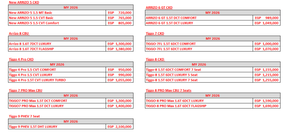 شاهندة إبراهيم – أعلنت شركة جي بي أوتو زيادة أسعار سيارات شيري موديلات 2026 للمرة الثالثة في شهرين، بقيمة وصلت إلى 140 ألف جنيه.
