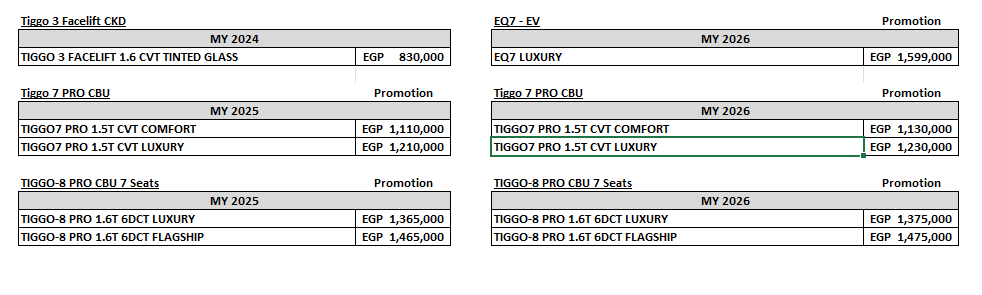 فيما أبقت الشركة على أسعار مجموعة من سيارات شيري عند مستوياتها المسجلة دون تغيير، ومنها شيري تيجو 7 برو المستوردة، لتباع الفئة الأولى بنحو مليون و110 ألف جنيه، والفئة الثانية بحو مليون 210 ألف جنيه.