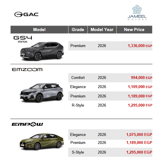 شاهندة إبراهيم – أعلنت شركة جميل موتورز ارتفاع أسعار سيارات GAC موديل 2026 بقيمة وصلت إلى 96 ألف جنيه.