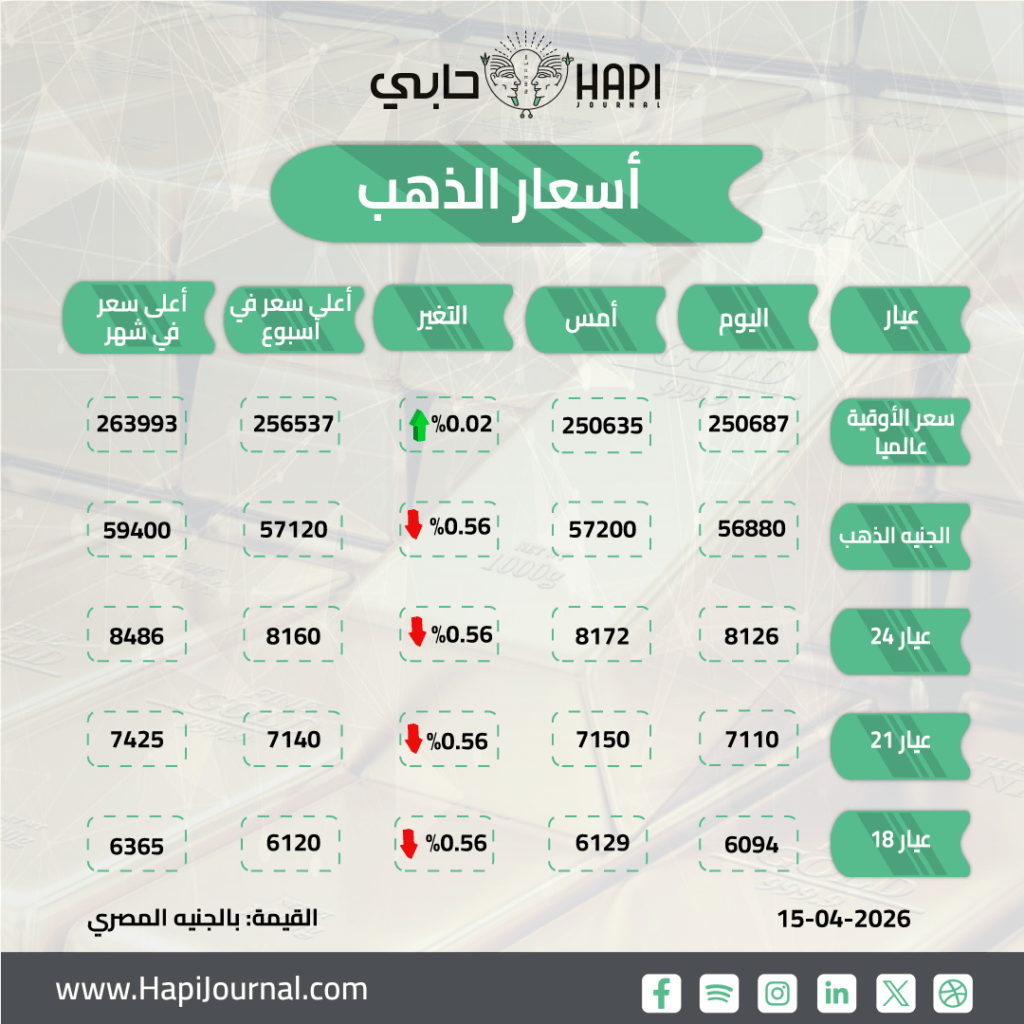 وسجل عيار 24 نحو 8126 جنيهًا، وعيار 18 حوالي 6094 جنيهًا، بينما بلغ سعر الجنيه الذهب نحو 56880 جنيهًا.