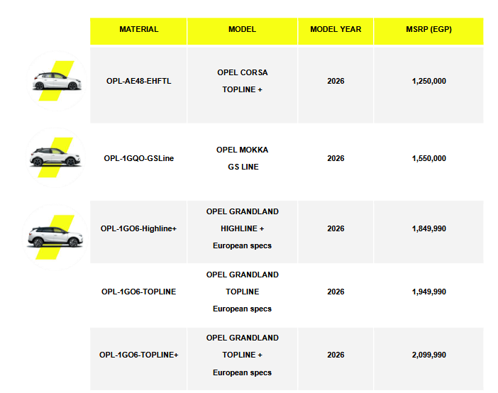 كما استقر سعر الفئة الأولى من السيارة أوبل جراند لاند عند 1.849.990 جنيه، والفئة الثانية حول 1.949.900 جنيه، والفئة الثالثة عند 2.099.990 جنيه.
