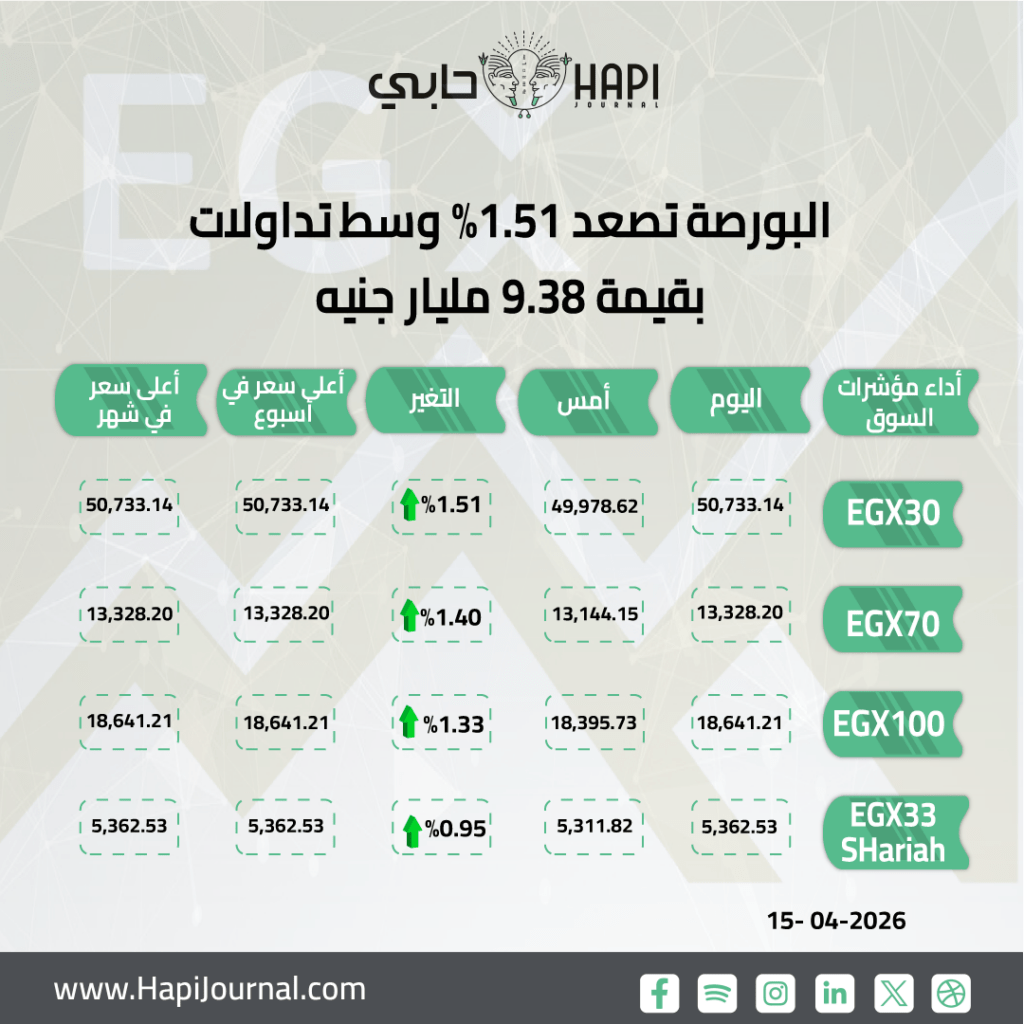 رنا ممدوح _ اختتمت مؤشرات البورصة المصرية تعاملات اليوم الأربعاء على ارتفاع جماعي، وصعد المؤشر الرئيسي EGX30 بنسبة 1.51%، وأغلق عند مستوى 50733 نقطة.