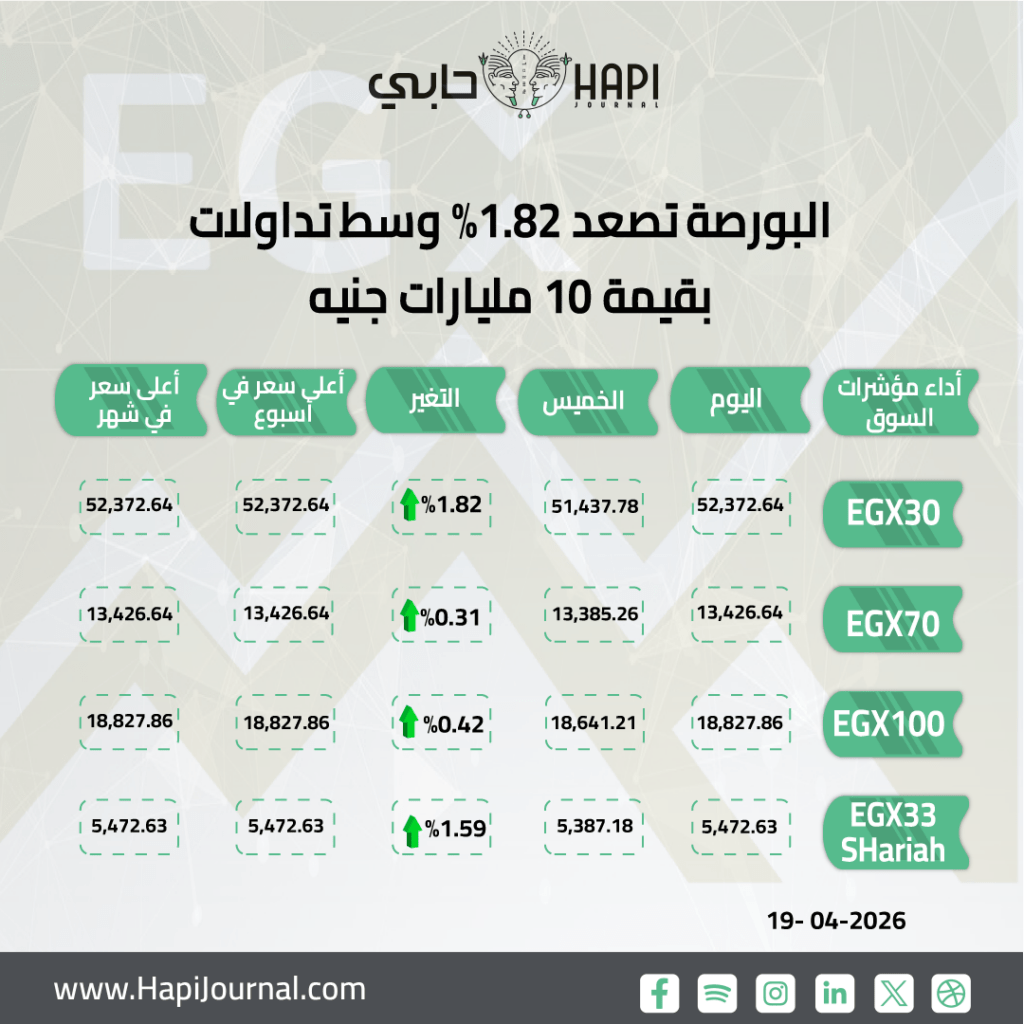 رنا ممدوح _ اختتمت مؤشرات البورصة المصرية تعاملات اليوم الأحد على ارتفاع جماعي، وصعد المؤشر الرئيسي EGX30 بنسبة 1.82%، وأغلق عند مستوى 52372 نقطة.