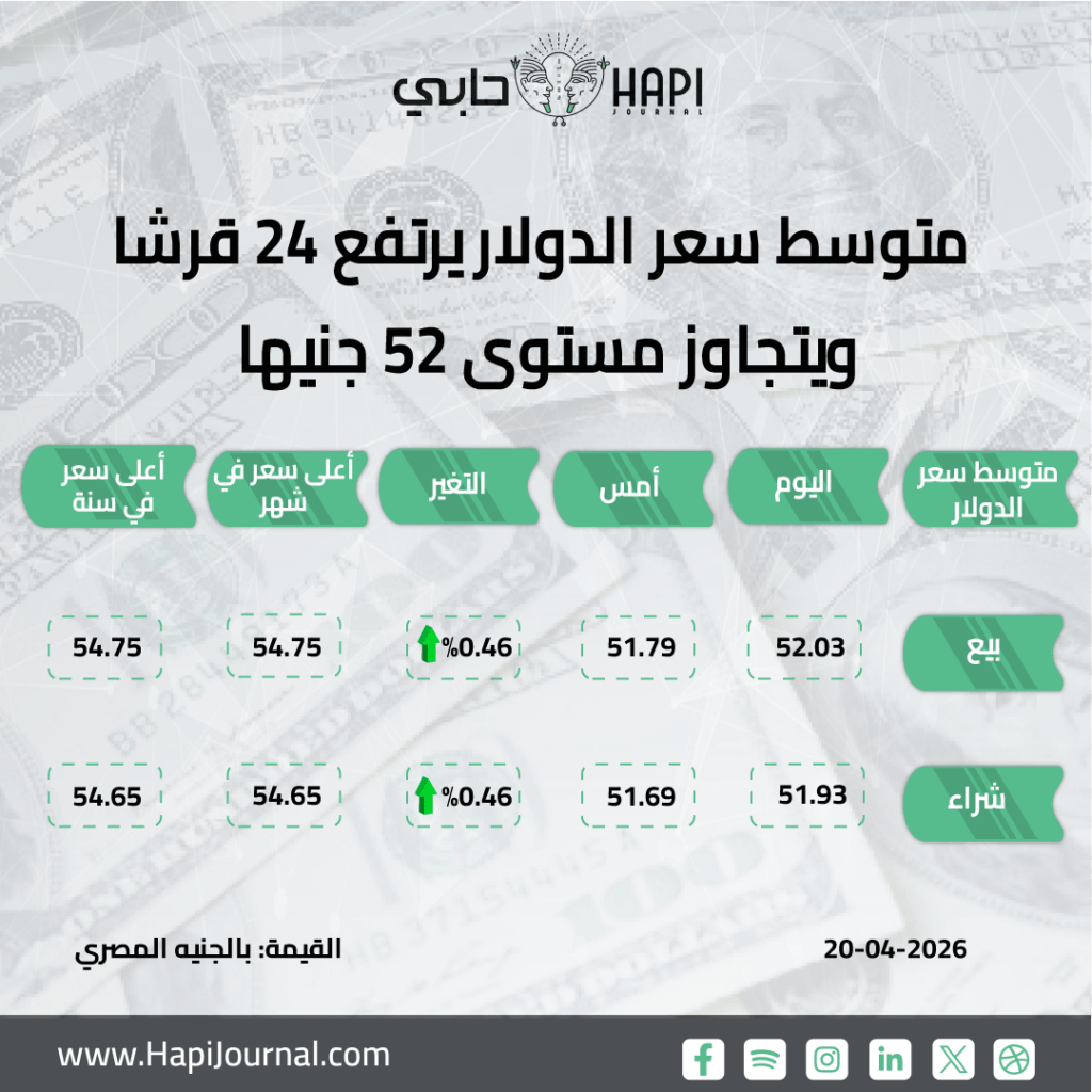 الدولار يرتفع 24 قرشا ليسجل متوسط البيع 52.03 جنيه ختام التعاملات