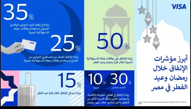 حابي_ كشفت شركة فيزا Visa عن أحدث تحليلاتها الخاصة بإنفاق المستهلكين خلال شهر رمضان وعيد الفطر في مصر، استنادًا إلى تقرير Visa Consulting & Analytics لرصد إنفاق قطاع التجزئة. وأوضحت البيانات ارتفاع الإنفاق باستخدام بطاقات Visa بنحو 50% على أساس سنوي، ما يعكس زيادة ملحوظة في الإنفاق عبر قطاعات السفر والتجزئة اليومية والمواد الغذائية.
