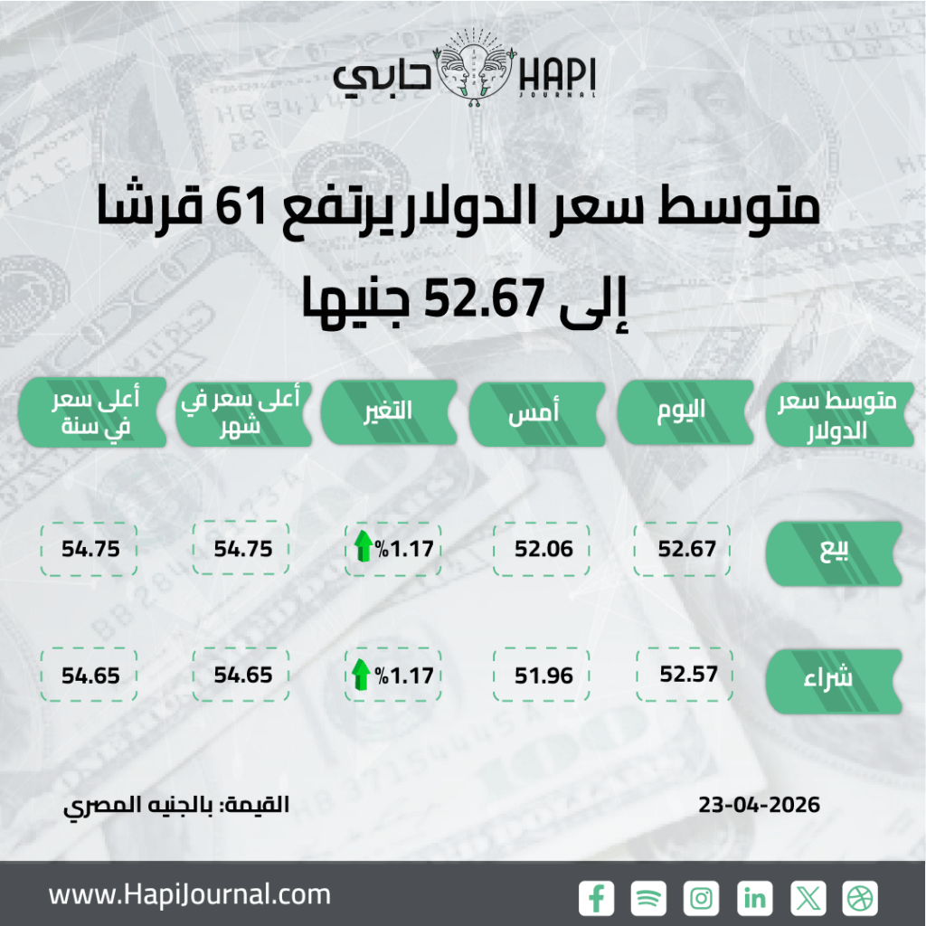 يارا الجنايني– صعد متوسط سعر صرف الدولار أمام الجنيه في ختام تعاملات اليوم الخميس بمقدار 61 قرشًا مقارنة بمستويات أمس، ليسجل متوسط سعر الشراء 52.57 جنيه ومتوسط البيع 52.67 جنيه، مقابل 51.96 جنيه للشراء و52.06 جنيه للبيع، وفقًا لبيانات البنك المركزي المصري.