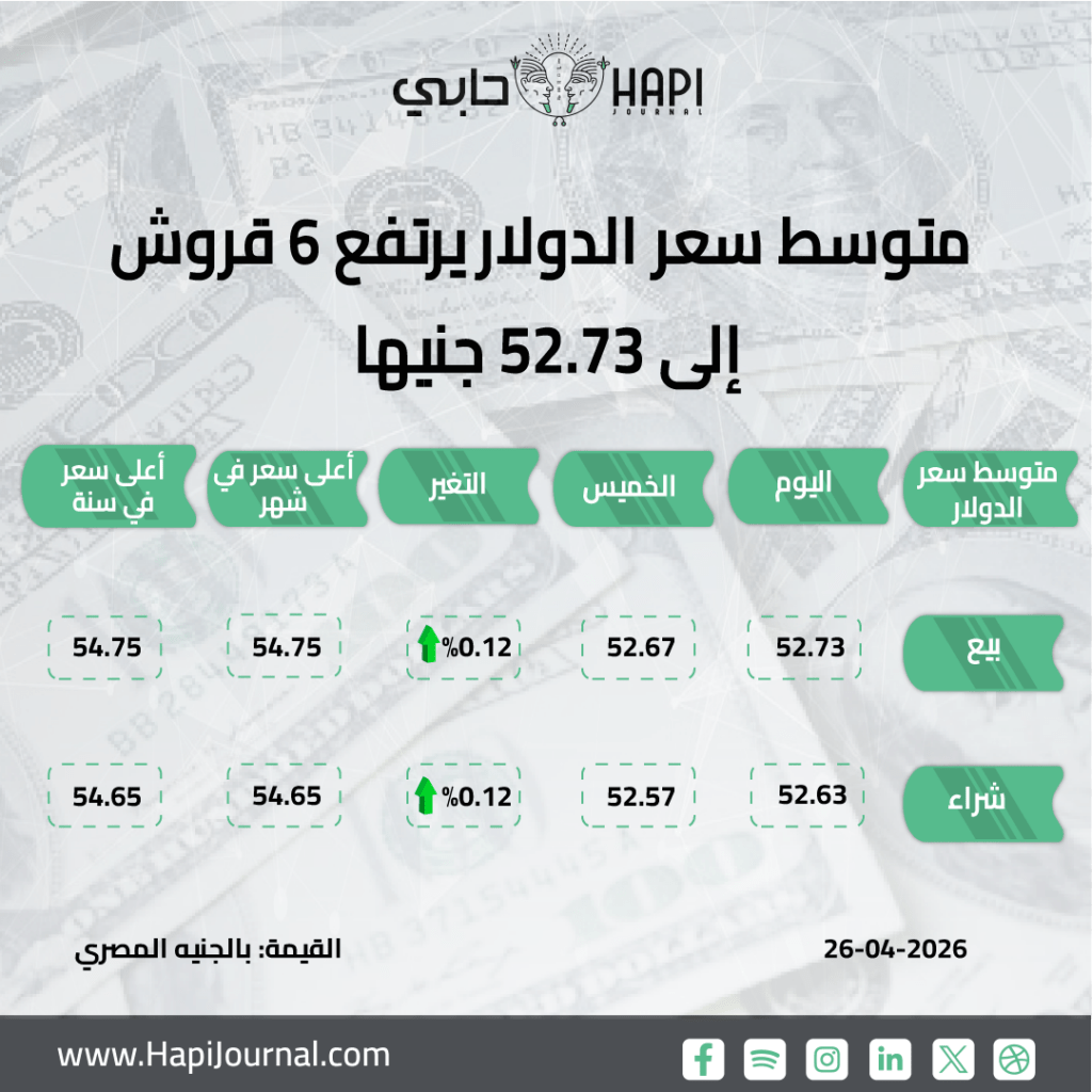 حابي – ارتفع متوسط سعر صرف الدولار بالبنوك بنحو 6 قروش خلال تعاملات اليوم الأحد، ليسجل 52.63 جنيه للشراء و52.73 جنيه للبيع.