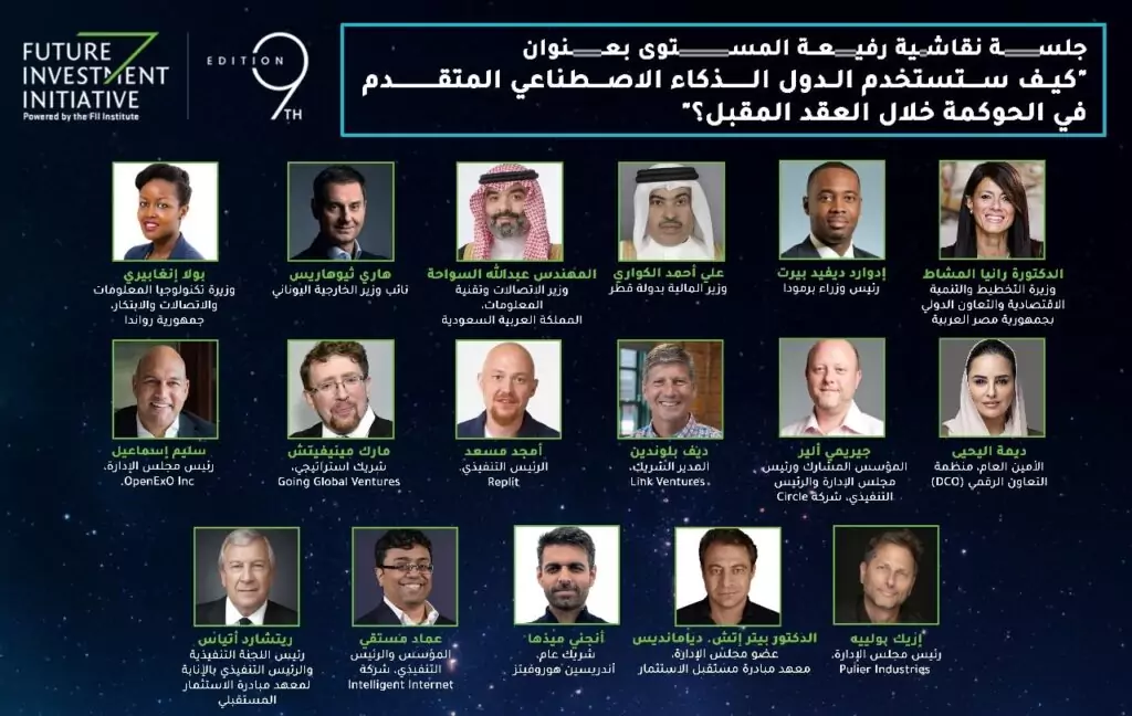 وترأس الجلسة ريتشارد أتياس، رئيس اللجنة التنفيذية لمعهد مبادرة مستقبل الاستثمار، وأنجني ميدا، شريك عام، شركة أندريسن هورويتز، وعماد مصطفى، المؤسس والرئيس التنفيذي، شركة Intelligent Internet، وشارك في النقاش المهندس عبدالله السواحة، وزير الاتصالات وتقنية المعلومات، المملكة العربية السعودية، وعلي أحمد الكواري، وزير المالية، وزارة المالية، دولة قطر، والعديد من ممثلي الحكومات وشركات القطاع الخاص.