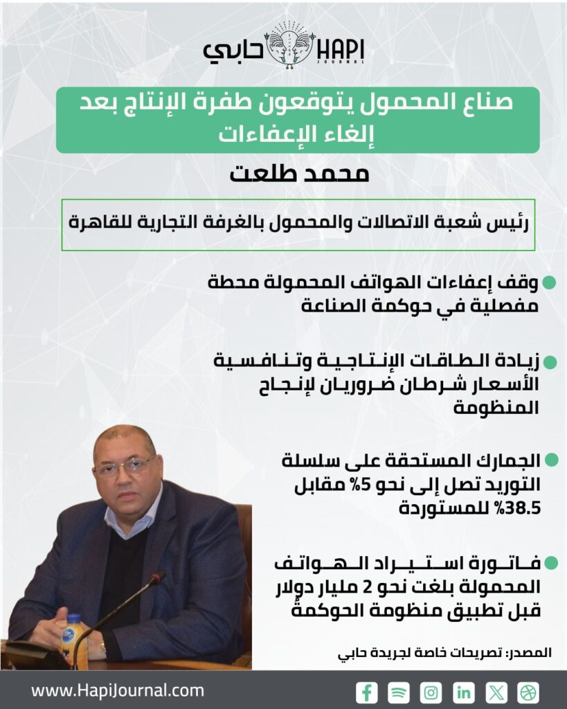وفي سياق آخر، قال إنه من الضروري زيادة الطاقات الإنتاجية لمصانع الهواتف المحمولة وتنافسية أسعار منتجاتها، خاصةً أن قيمة الجمارك المستحقة على سلسلة التوريد من مكونات الإنتاج للتجميع المحلي تصل إلى نحو 5%، مقابل 38.5% في حال استيراد الهواتف بالكامل من الخارج.