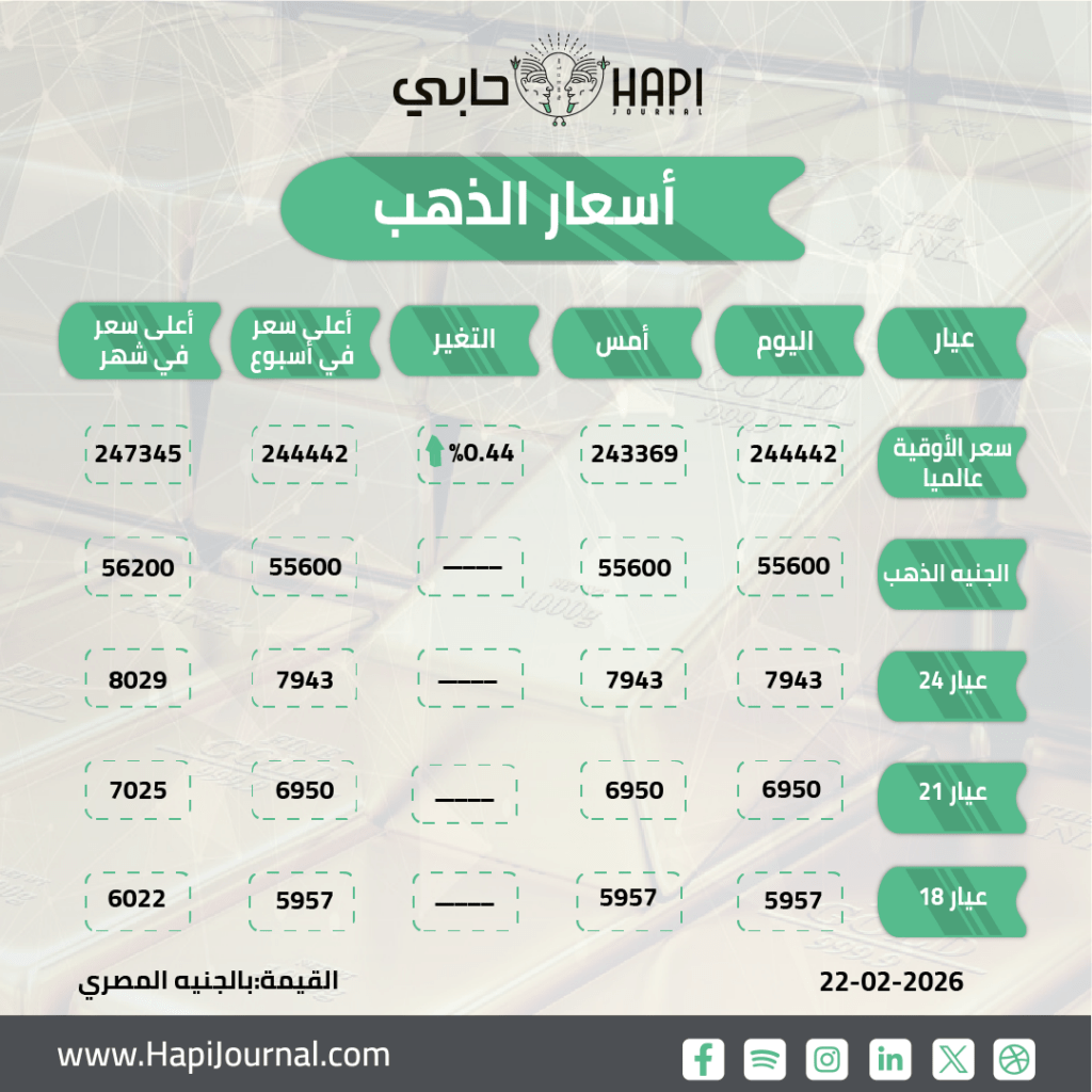 وسجل جرام الذهب عيار 24 نحو 7914 جنيهًا، وبلغ عيار 18 نحو 5936 جنيهًا، فيما وصل سعر الجنيه الذهب إلى قرابة 55,400 جنيه.